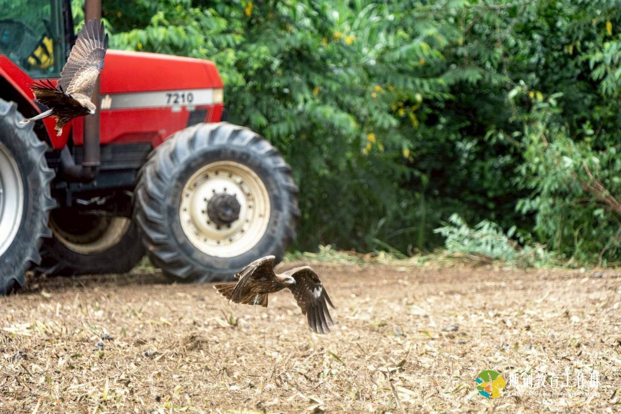 ▲銘泉生態休閒農場於冬季翻耘鳳梨田時,常可觀察到黑鳶伴飛覓食,結合園區有機鳳梨體驗,發展出「與鳥共耕一日體驗」